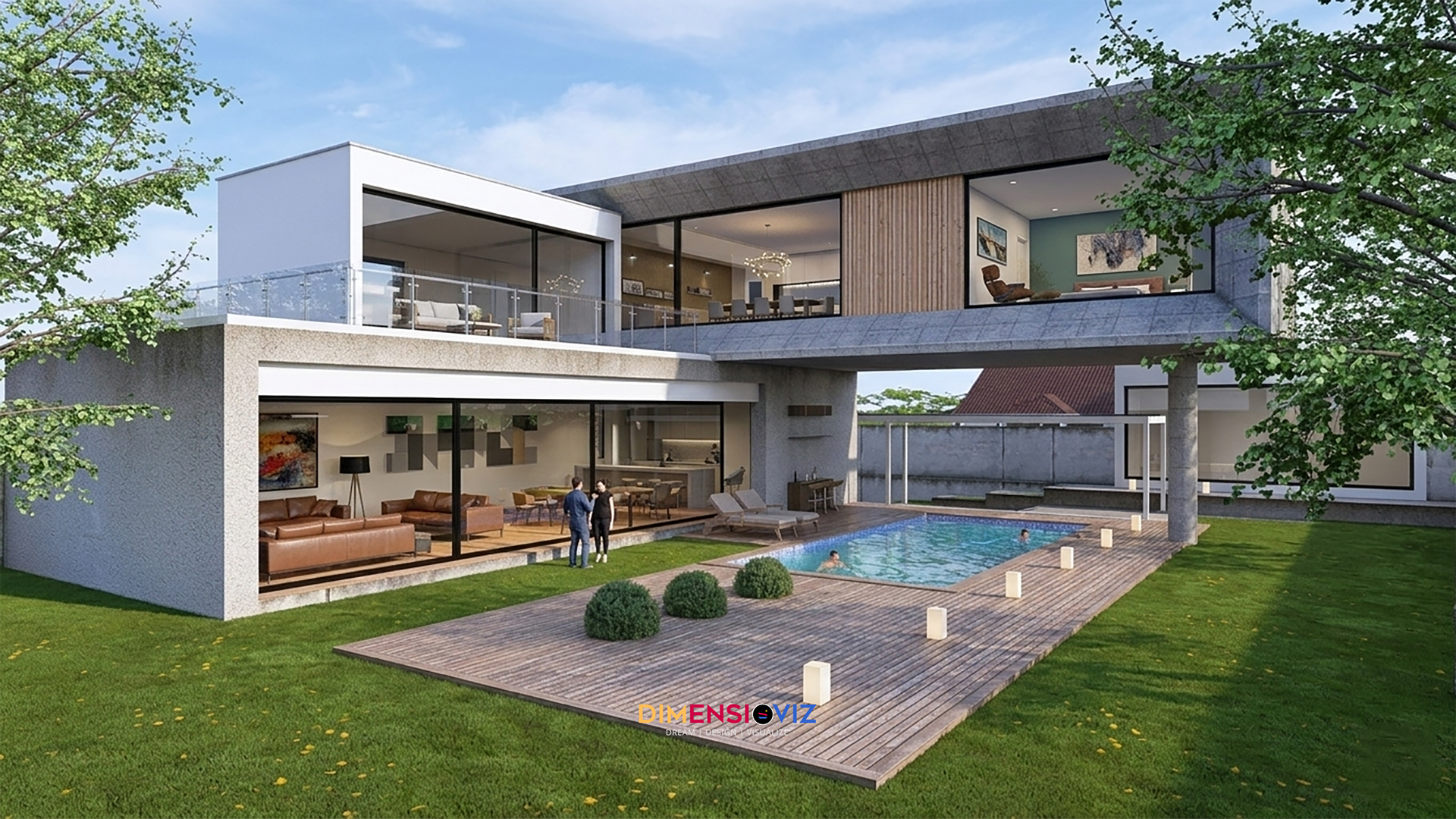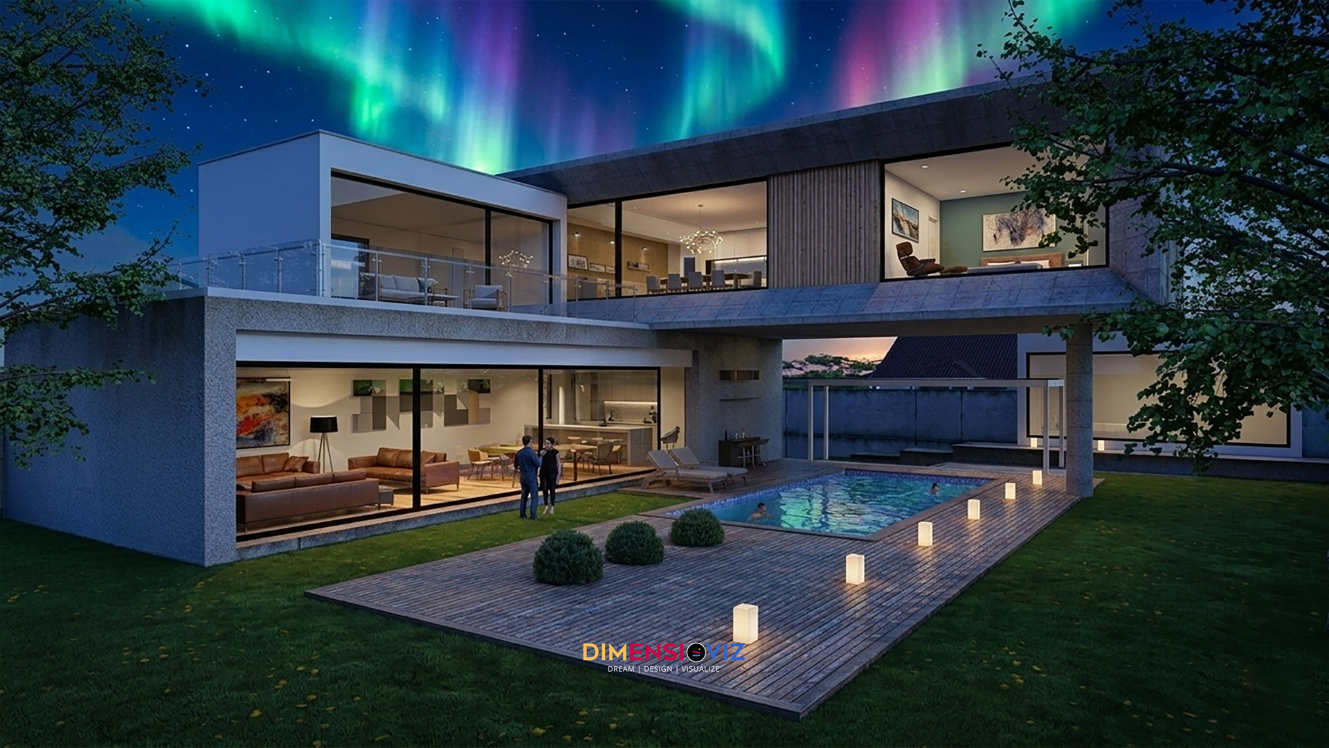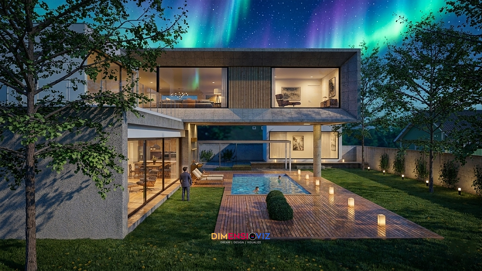 Aurora House explores the intersection of bold, geometric volumes and the raw beauty of natural light. This project focuses on a dual-lighting narrative: the crisp, high-contrast clarity of a midday sun versus the ethereal, vibrant glow of a northern night. Key architectural features include a dramatic cantilevered second story that provides shaded outdoor lounging and an seamless indoor-outdoor transition through expansive floor-to-ceiling glazing. The material palette balances industrial textured concrete with the warmth of natural wood slatting, all brought to life through hyper-realistic textures and physically accurate light simulations.