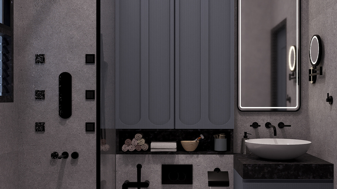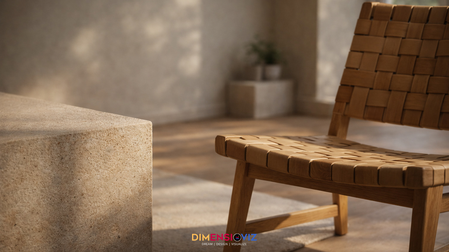 A combination of natural stone and warm wood adds texture, grounding the space with subtle luxury.