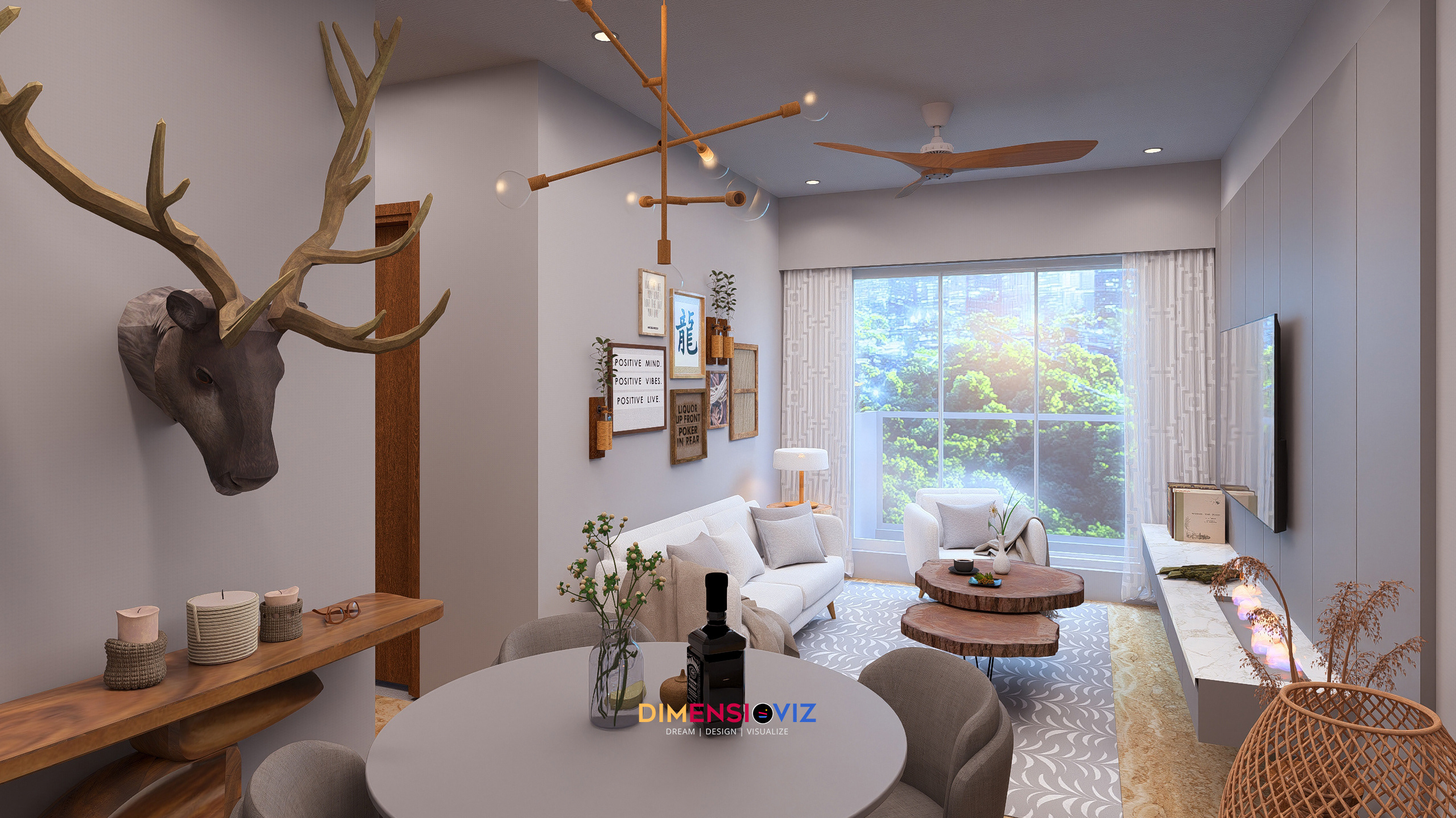 A soft, neutral palette creates a serene environment, enhanced by natural light and visual openness.