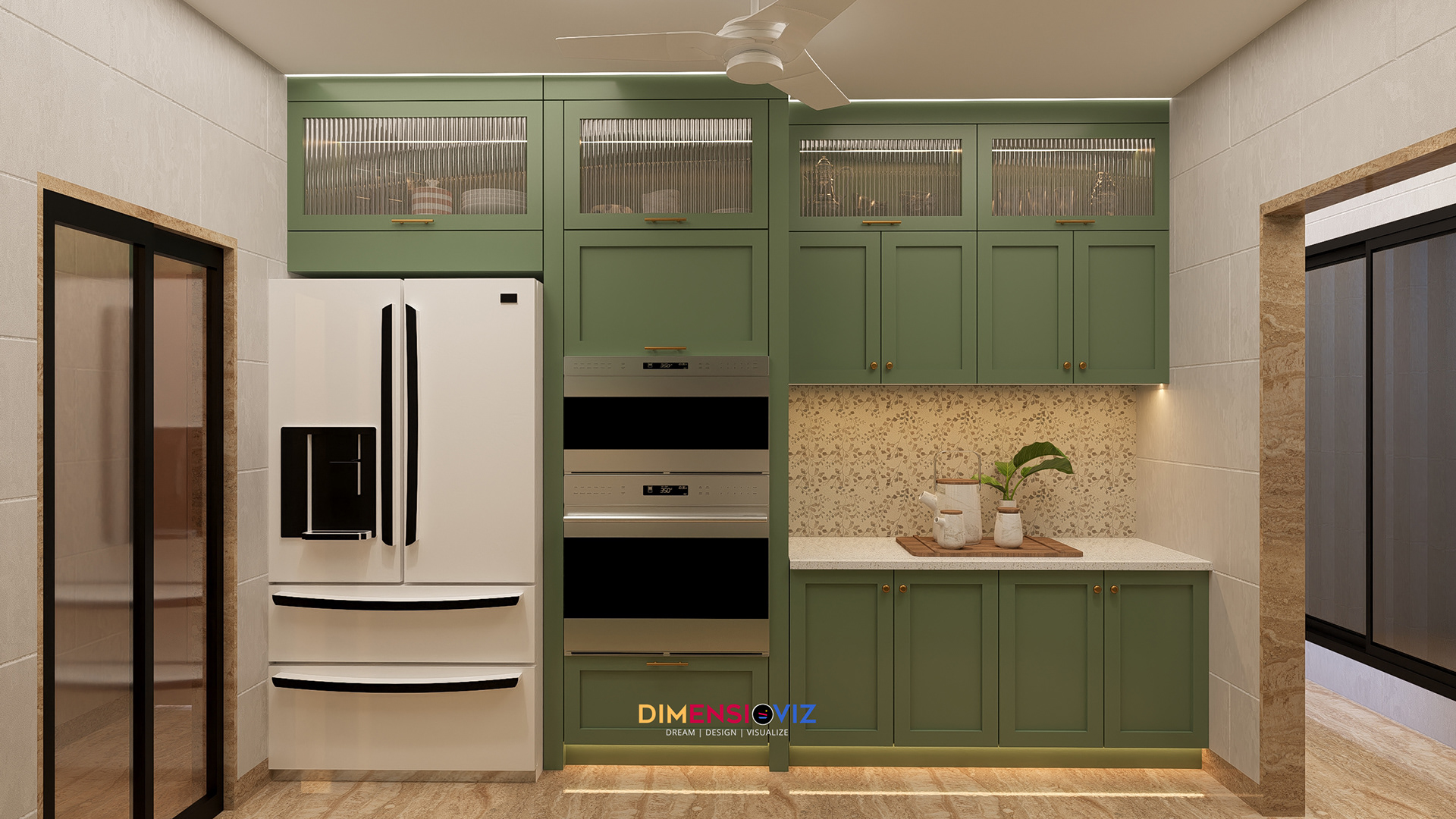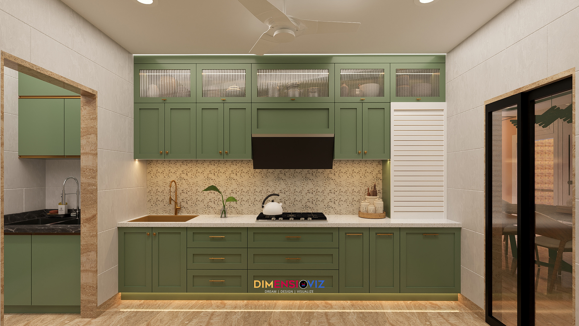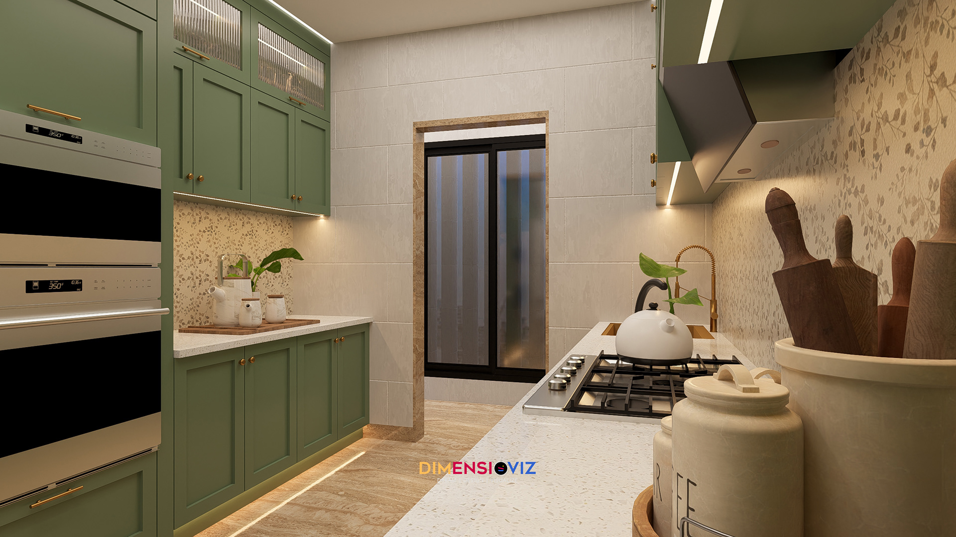 Kitchen 3D Visualization — A warm, modern interior designed with soft green cabinetry, textured surfaces, and clean lighting. This concept focuses on balanced proportions, functional layout, and a refined material palette that brings comfort and elegance into the space. The design features classic shaker-style cabinets, paired with ribbed glass uppers and brushed brass hardware, adding character while maintaining a contemporary feel. A stone-textured backsplash, subtle under-cabinet lighting, and integrated built-in appliances enhance the realism and functionality of the composition. The neutral walls and flooring create contrast that highlights the fresh green tones and the overall visual harmony. Every element—from the lighting accents to the detailed materials—was crafted to create a calm, practical, and aesthetically pleasing kitchen environment. Explore the render, notice the detailing, and follow for more interior visualization projects.