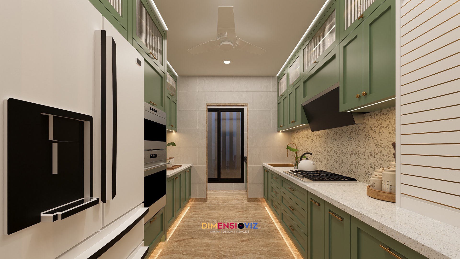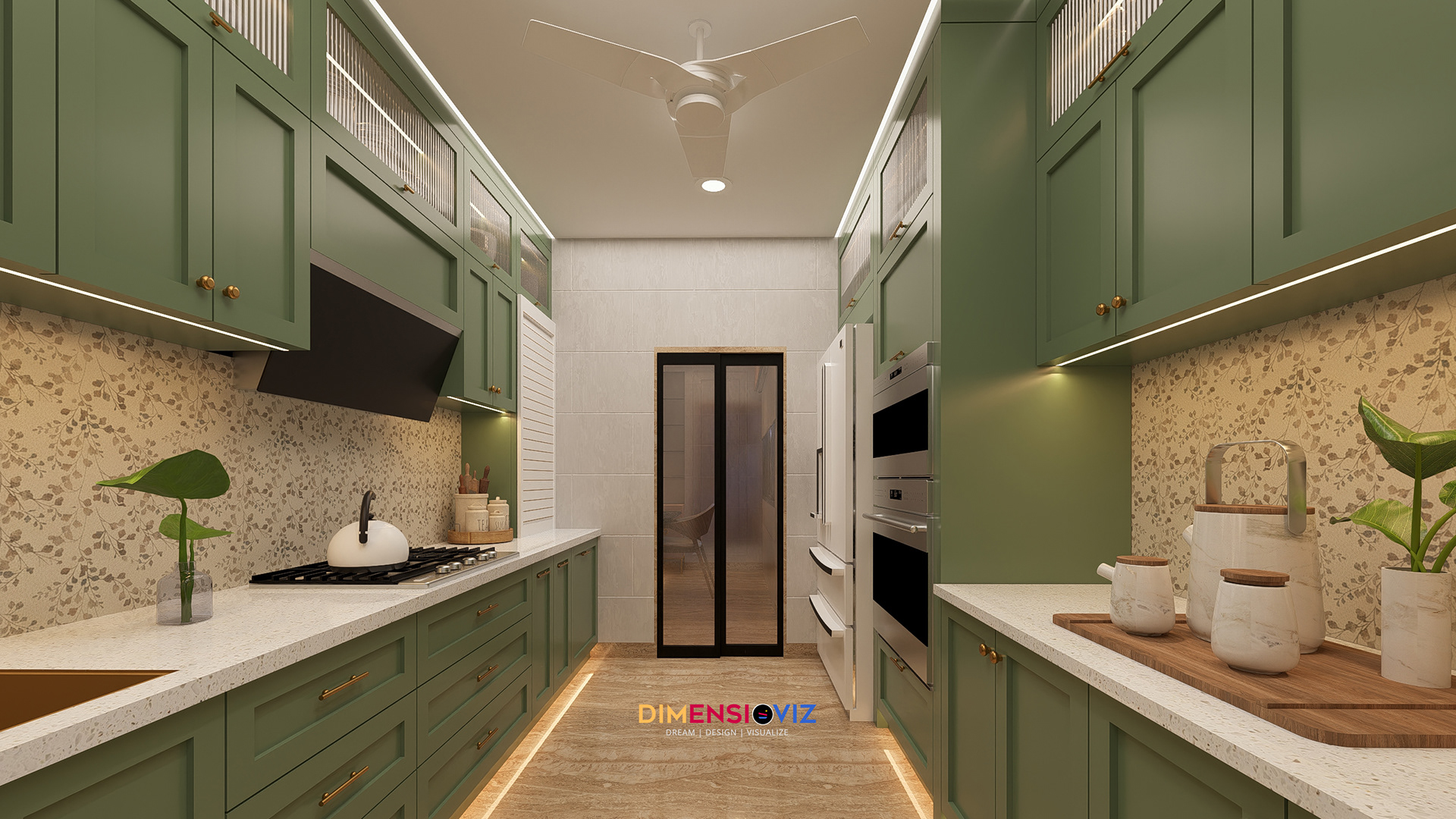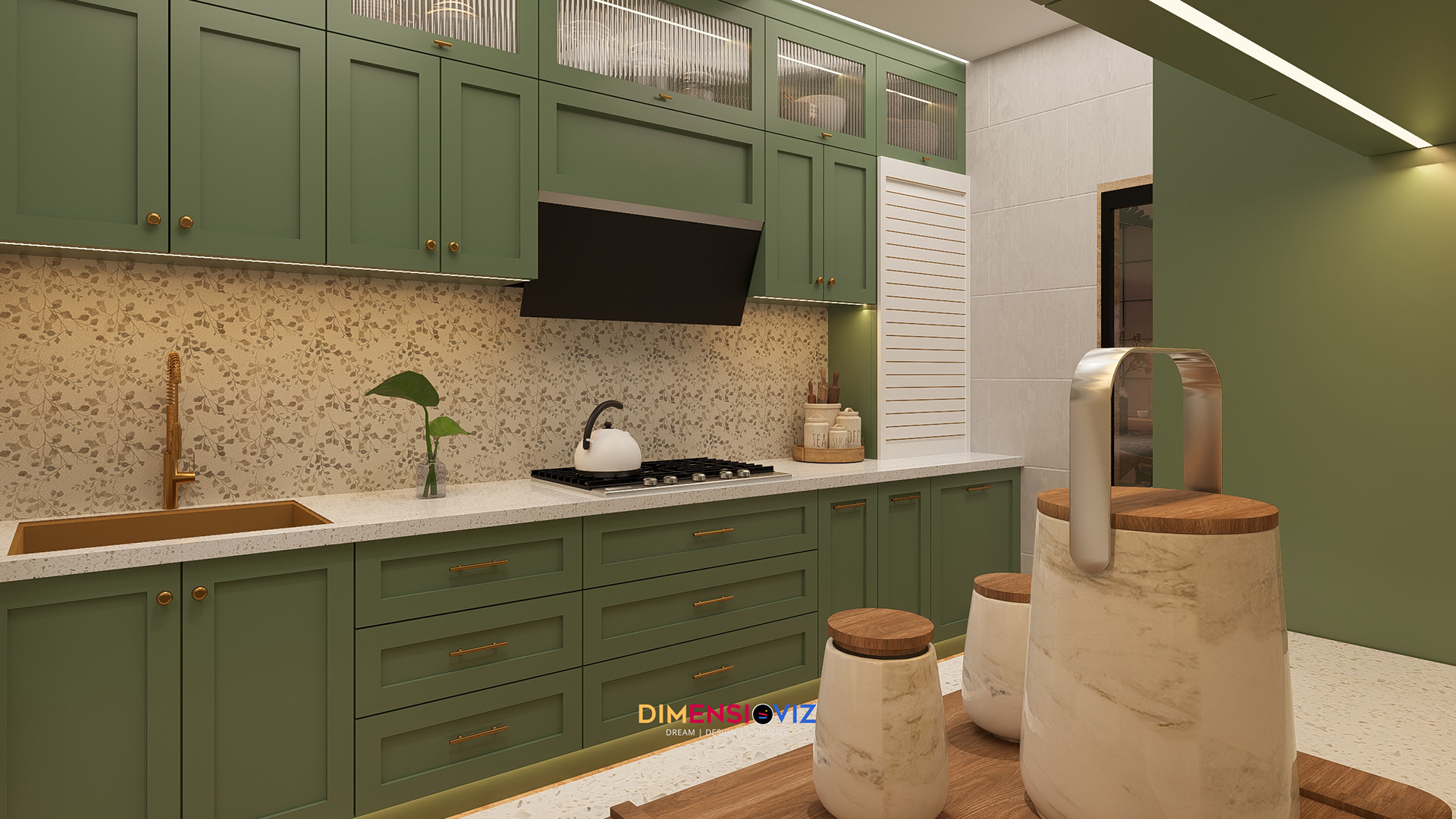 Kitchen 3D Visualization — A warm, modern interior designed with soft green cabinetry, textured surfaces, and clean lighting. This concept focuses on balanced proportions, functional layout, and a refined material palette that brings comfort and elegance into the space. The design features classic shaker-style cabinets, paired with ribbed glass uppers and brushed brass hardware, adding character while maintaining a contemporary feel. A stone-textured backsplash, subtle under-cabinet lighting, and integrated built-in appliances enhance the realism and functionality of the composition. The neutral walls and flooring create contrast that highlights the fresh green tones and the overall visual harmony. Every element—from the lighting accents to the detailed materials—was crafted to create a calm, practical, and aesthetically pleasing kitchen environment. Explore the render, notice the detailing, and follow for more interior visualization projects.