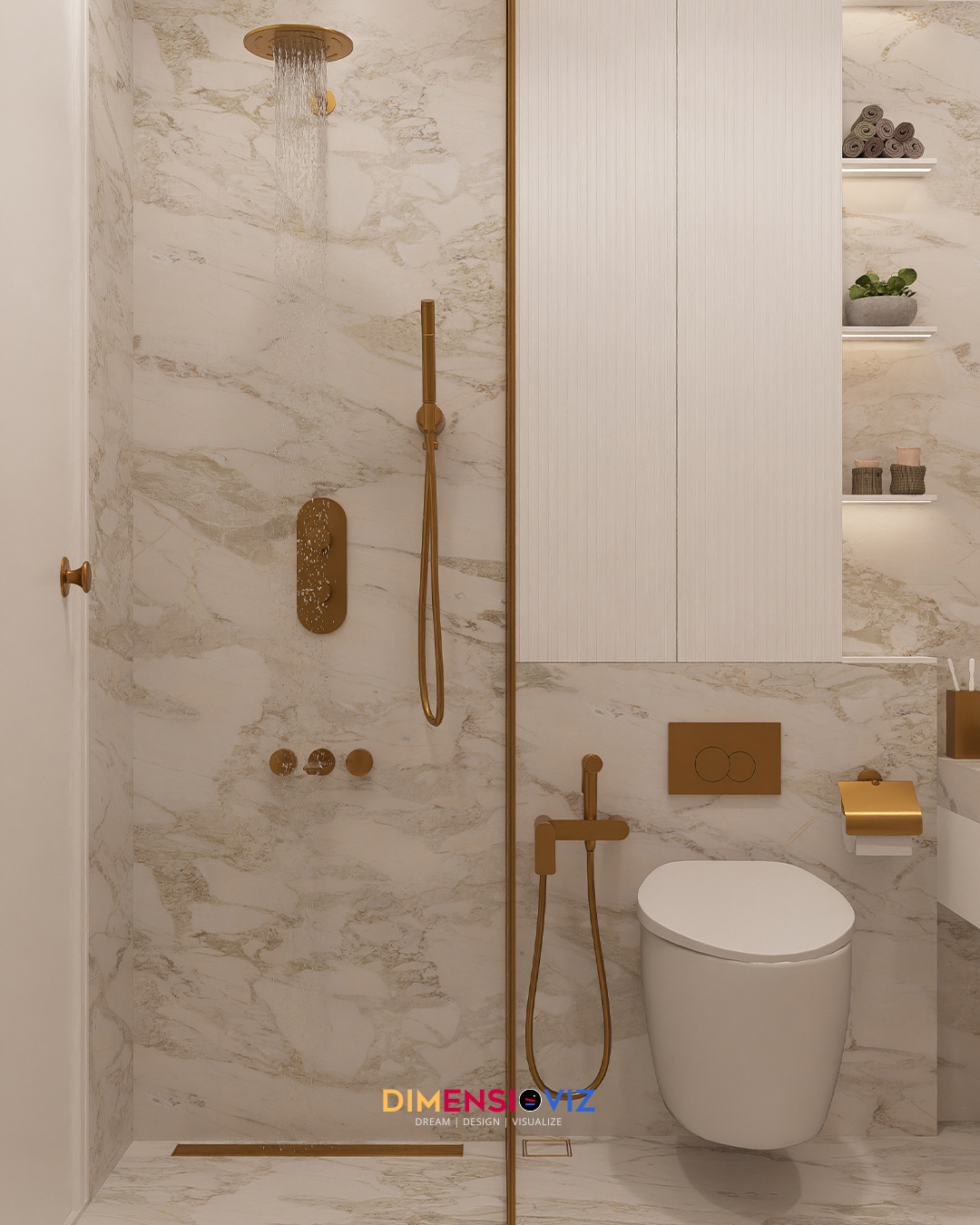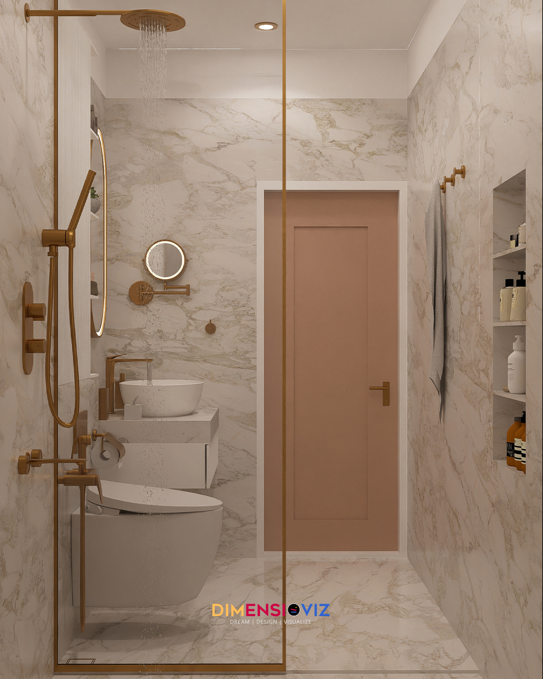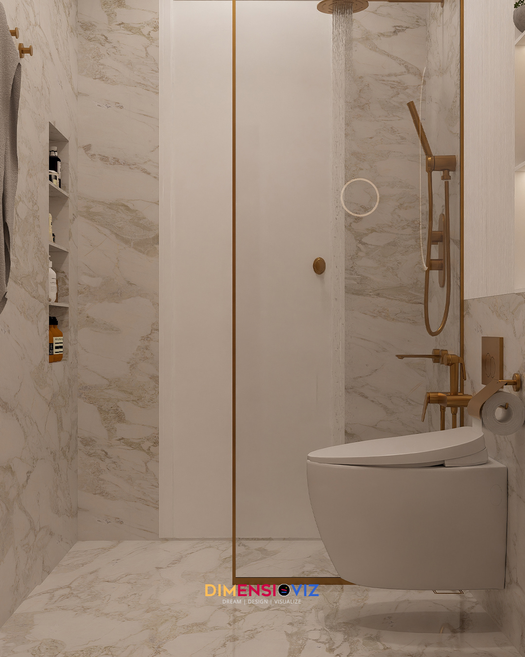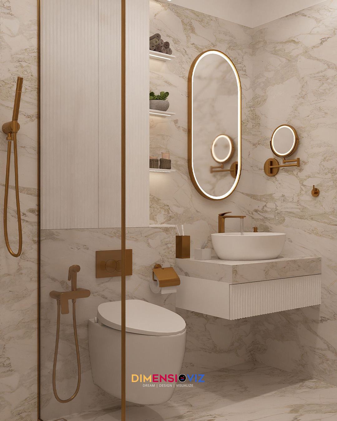Modern Luxe Bathroom — Marble & Brushed Gold Interior Design This bathroom concept blends warm marble textures, brushed gold accents, and soft ambient lighting to create a serene, spa-like atmosphere. The design focuses on clean lines, minimalism, and functional elegance. Key features include a floating fluted vanity, backlit oval mirror, frameless glass shower partition, and wall-mounted WC for a sleek, spacious layout. Integrated shelving with LED lighting adds both storage and decor value, while the brushed gold fixtures elevate the overall aesthetic with a luxurious touch. The materials and lighting were carefully curated to highlight the natural veining of the marble and maintain a harmonious color palette throughout the space. The result is a modern bathroom that feels both timeless and indulgent.