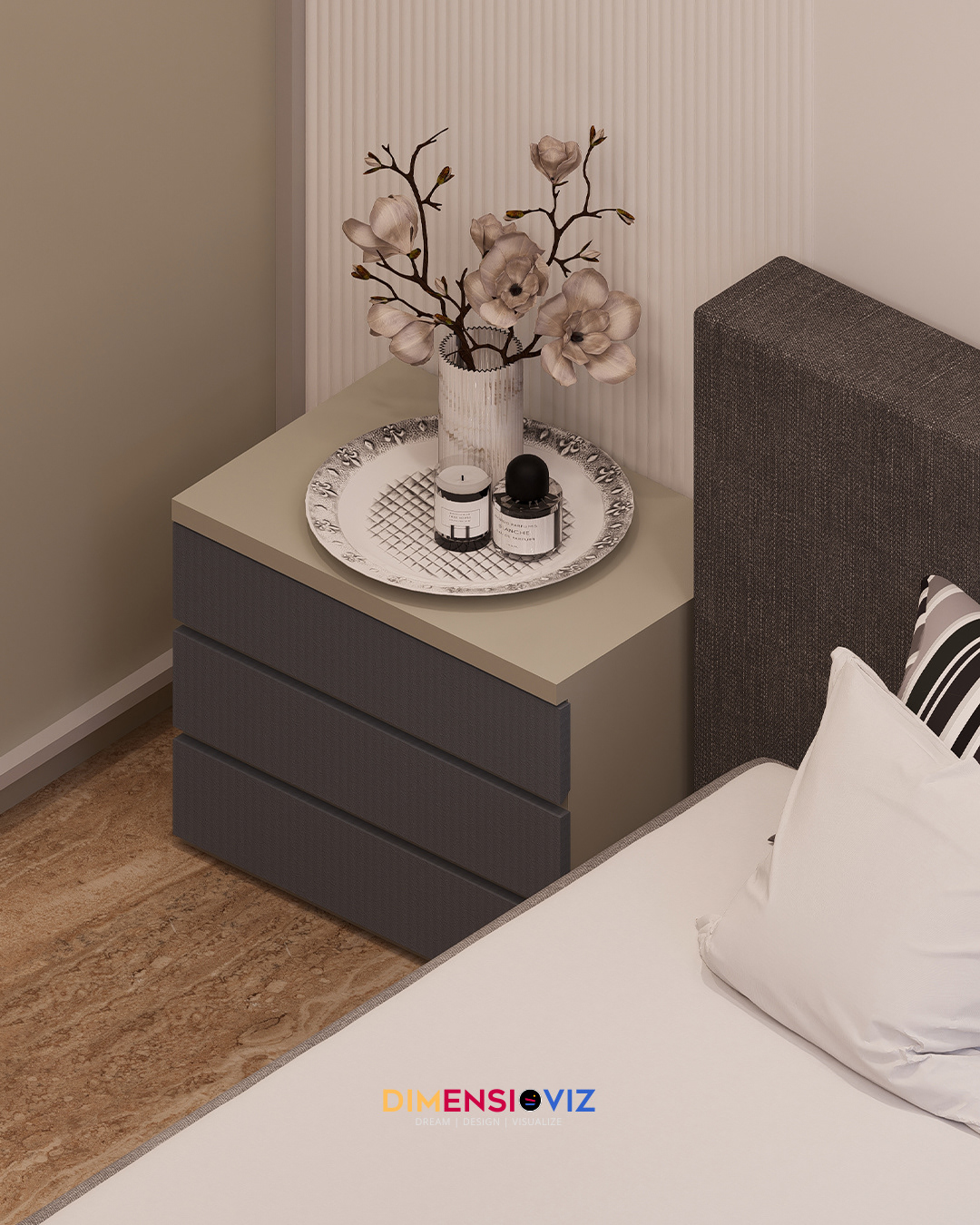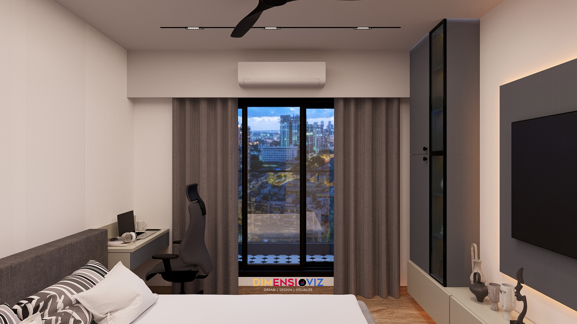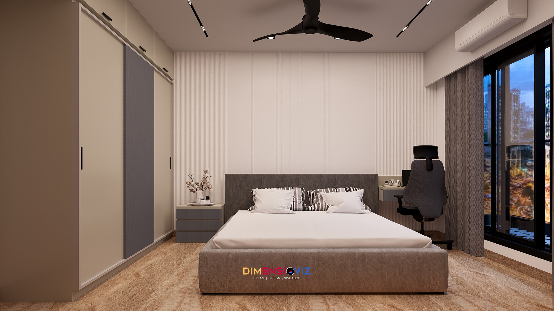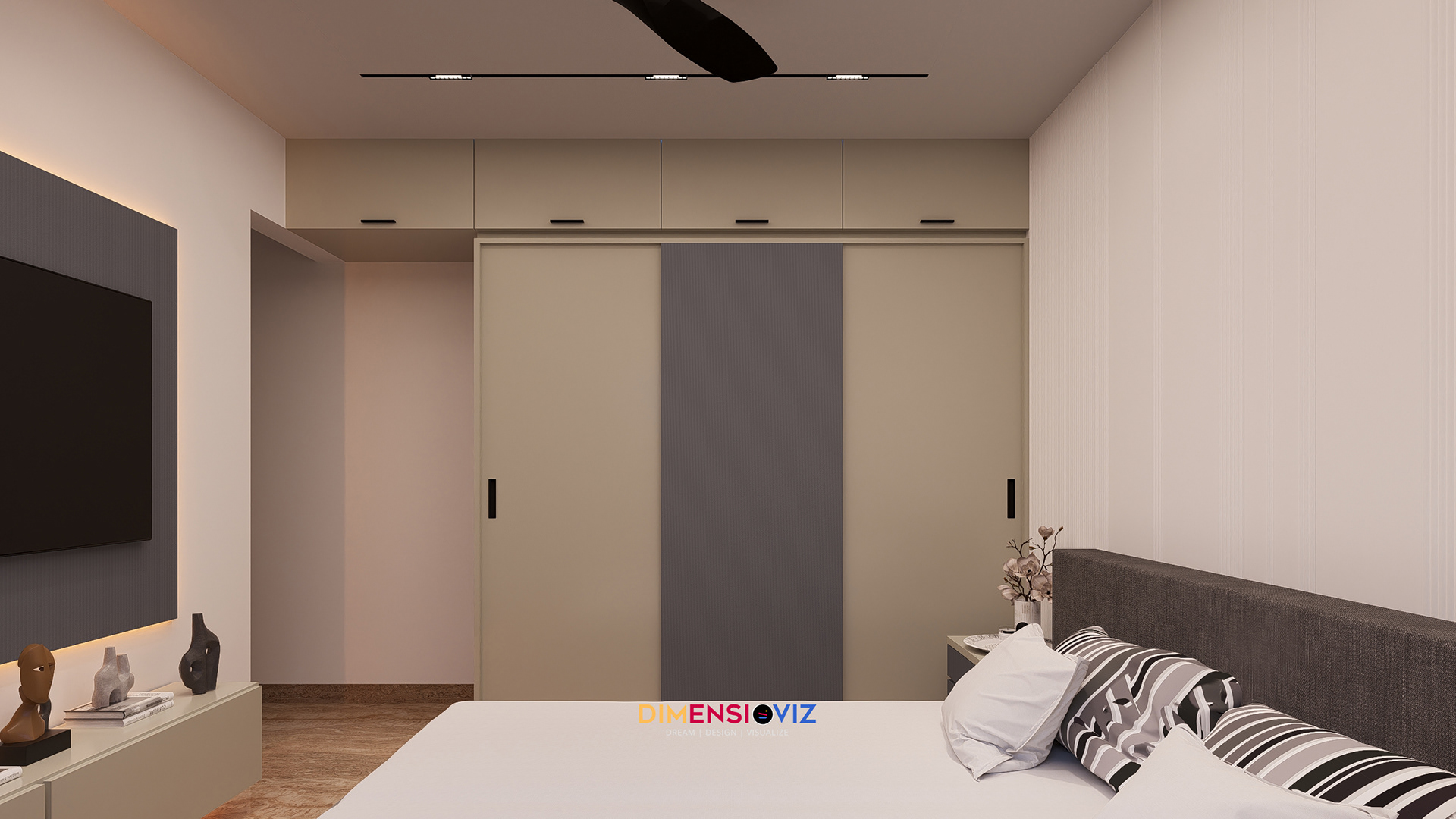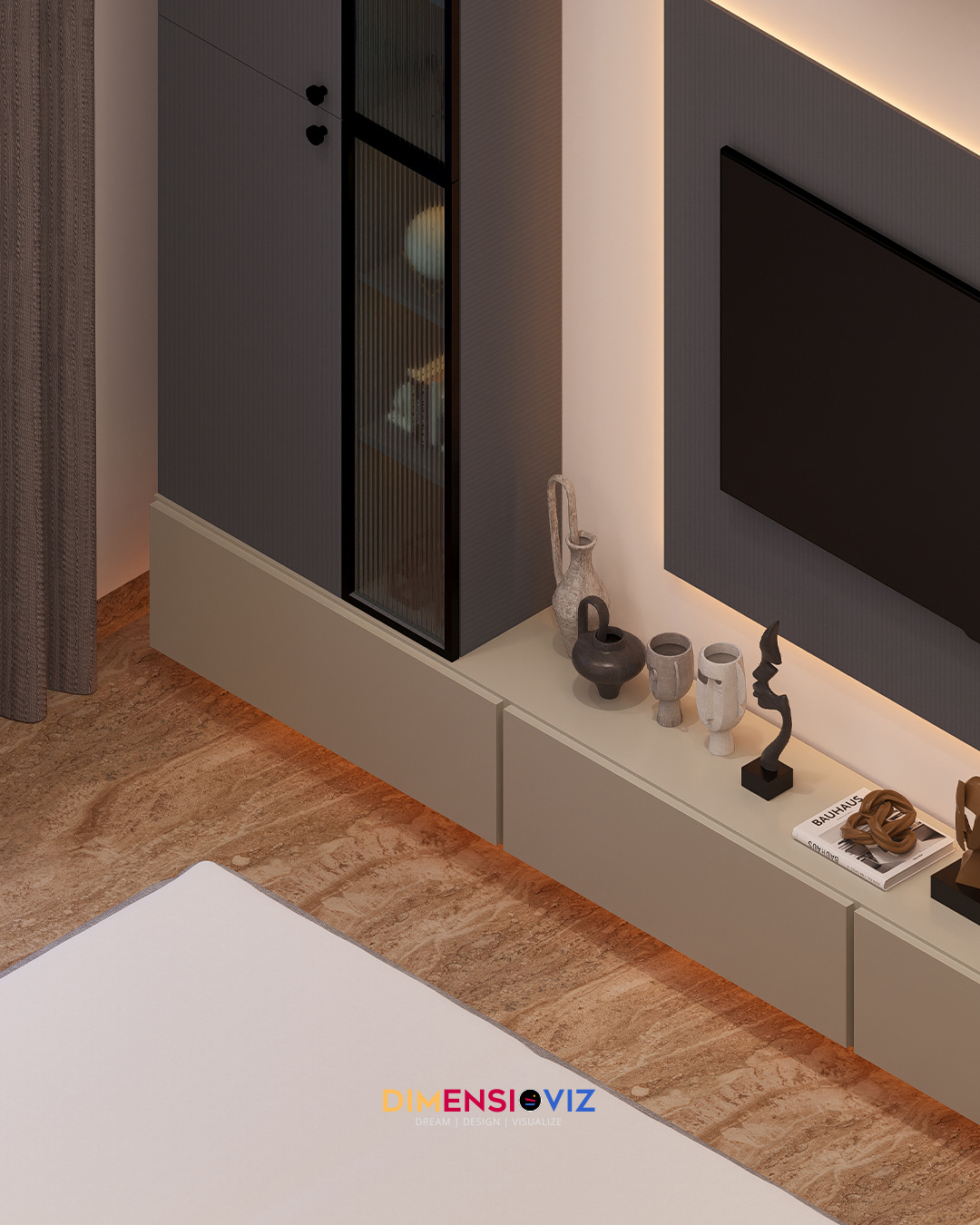 This project showcases a modern bedroom interior designed with a focus on clean lines, balanced proportions, and warm ambient lighting. The TV wall acts as a visual anchor, combining textured panels, concealed LED lighting, and curated décor elements to create a refined yet cozy atmosphere. Neutral tones, minimalist furniture, and subtle material contrasts enhance the sense of calm while maintaining a contemporary aesthetic. The design emphasizes functionality without compromising on visual elegance, making it ideal for modern urban living.